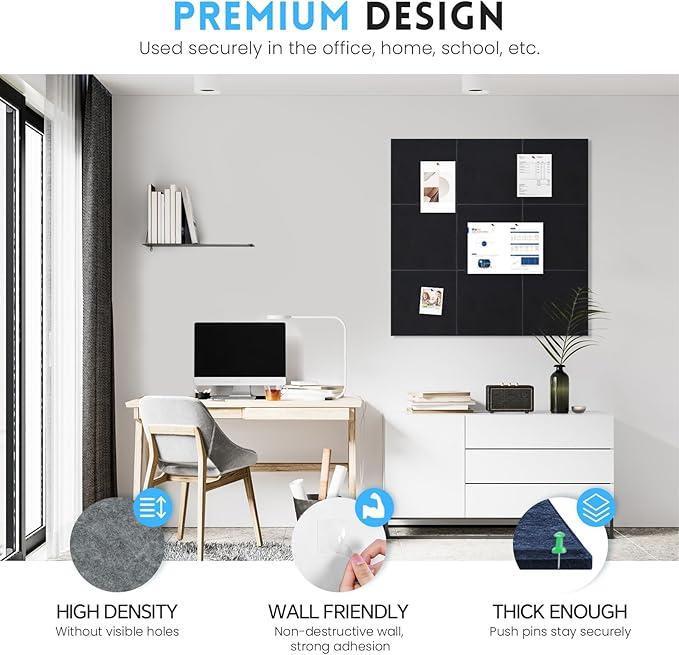 - Perfect Cork Board Alternative - Replace your old-fashion bulletin board with our more affordable and stylish felt board, this customizable pin board is more suitable for home, office, school and any other spaces. The set includes 12 pack felt wall panels, 80 push pins, 60 adhesive tabs and user manual.