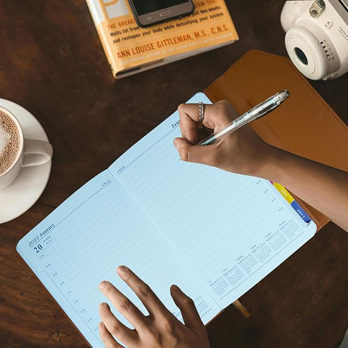 2025 Daily Monthly Planner - Calendar, January - December 2025, 100GSM Thick Paper, Leather Cover, Planner with Hourly Schedule,6.1" x 8.2", Daily Inside Page - Monthly Inside Page, Pen Holder, Bookmarks (Brown)
