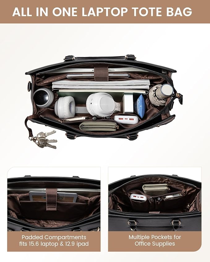 - Multiple Pocket Tote Bag: Features a dedicated padded laptop compartment for laptops up to 15.6 inches, an iPad pocket, a main compartment for daily essentials, side pockets for water bottles, tissues, or umbrellas.This tote bag for women keeps your belongings organized and easy to find!