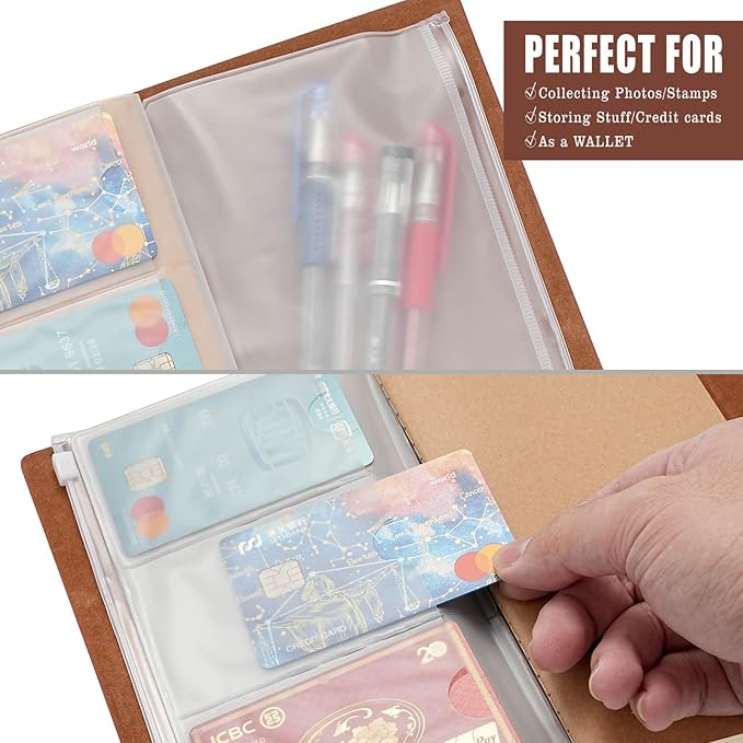 - Refillable & Pocket:This is a notebook for life and you can easily add refill new paper.It also has 6 small pockets (double-sided) for credit cards , ID card or pictures and so on, and a spacious closed pocket for bills, receipts,phone,coupons, tickets etc.Elastic closure helps keep leather notebook securely closed.