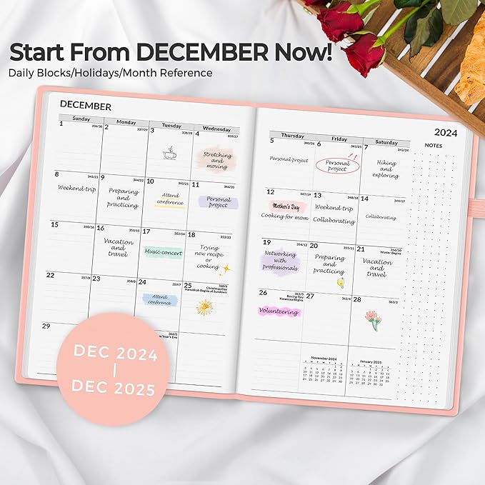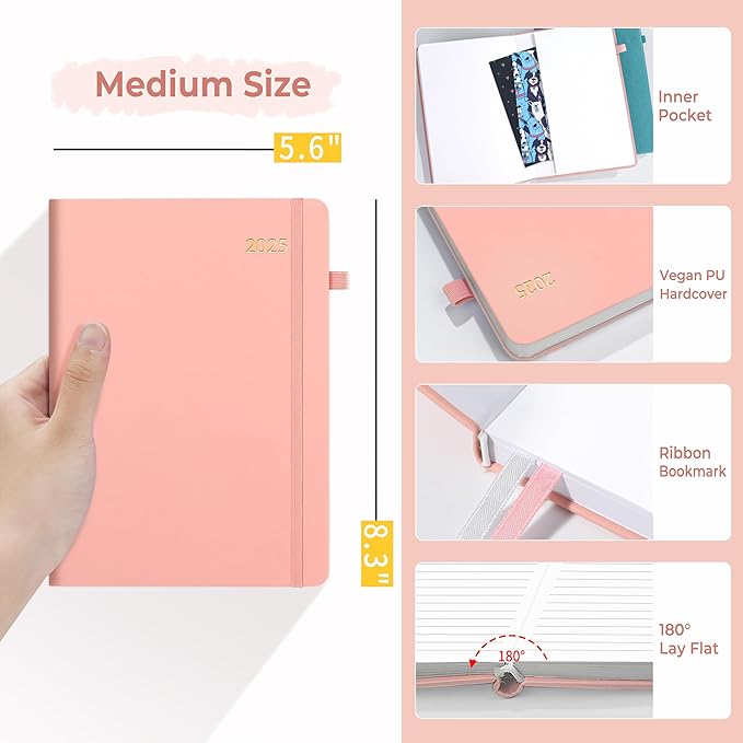 SUNEE 2025 Weekly & Monthly Hardcover Planner 5.5" x 8.3" - 12 Month (January 2025 - December 2025), Small Hardcover Planner, Pocket, Notes, 100 GSM Paper, Peach Pink