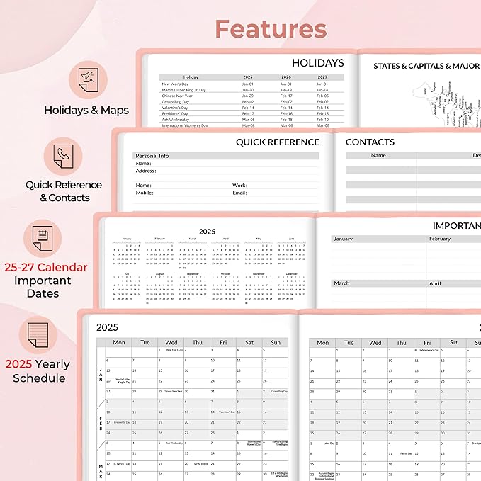 - Additional Features - The weekly planner includes 2025-2027 calendars, holiday lists, contact pages, notes pages, important dates, and US time zone map.