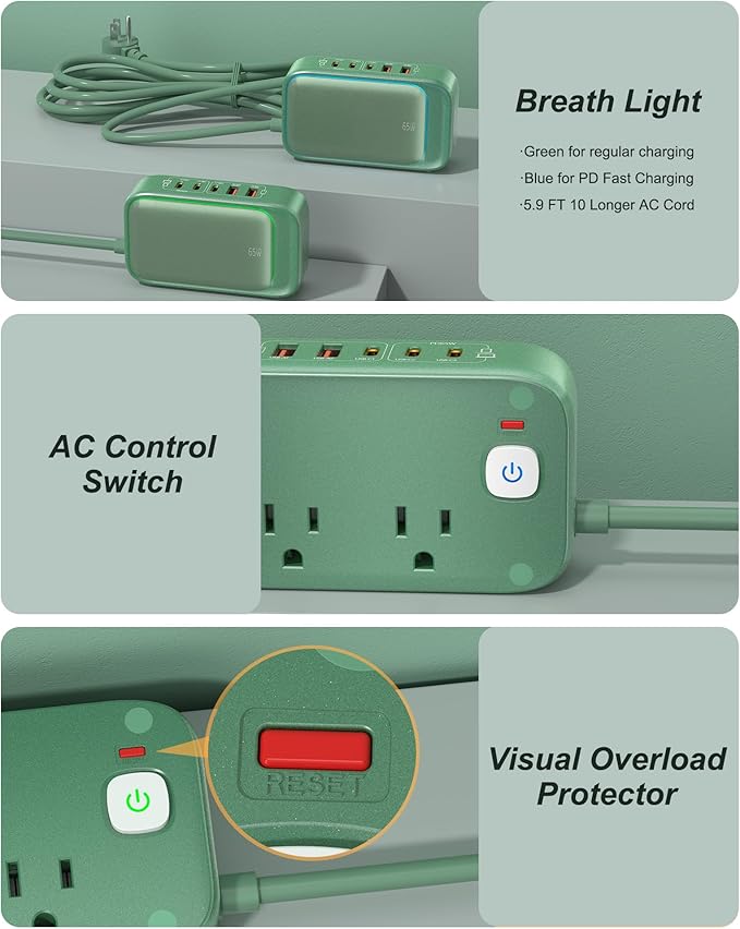 Surge Protector Power Strip with USB Ports, 7-in-1 65W Desktop Charging Station Outlet Extender with 2 AC Outlets, 3 USB-C and 2 USB-A Ports for Laptop/Phone and More