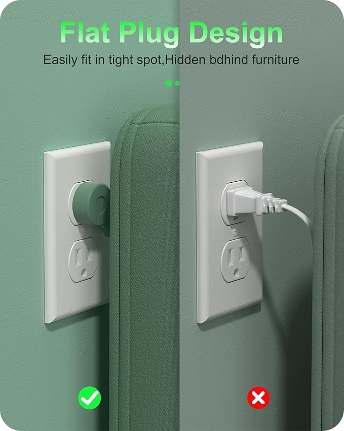 - 45° Flat Wall Plug Design: The power strip with flat plug design reduces the space it occupies, Its unique angle and slim profile allow easy insertion behind furniture, improve socket accessibility, and reduce clutter. 45° plug makes it easier to insert the plug into the socket, Especially when sockets are used parallelly, 45° flat plugs won't block adjacent outlets, thereby improving socket utilization
