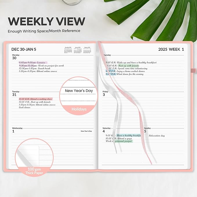 - Weekly View - 2-page weekly spread from Monday to Sunday provides generous lined writing space along with popular holidays and month reference previews, allowing for easy appointment, note, and daily task management.