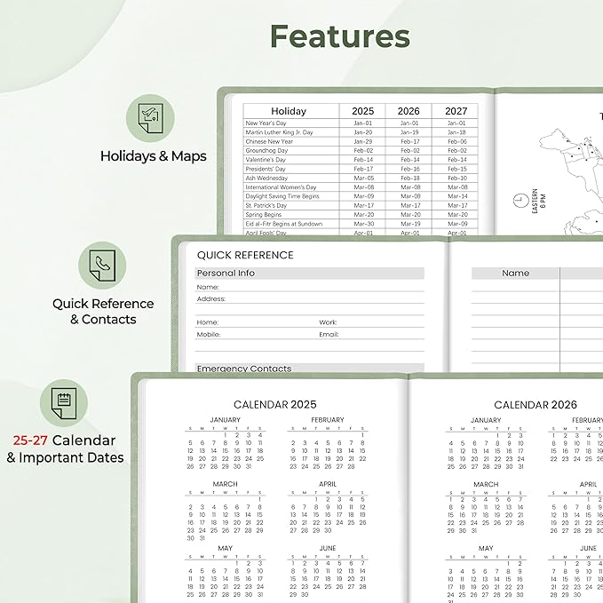 - Additional Features - The weekly planner includes 2025-2027 calendars, holiday lists, contact pages, notes pages, important dates, and US time zone map.