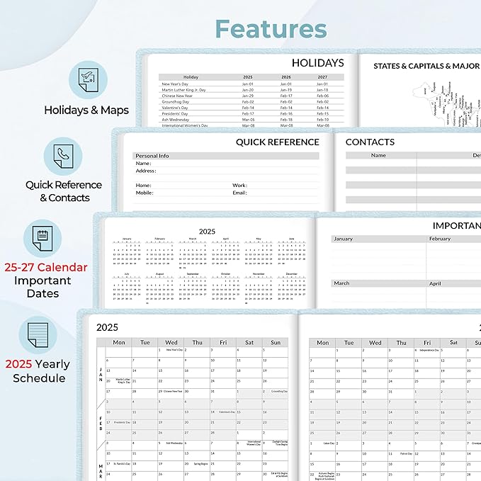 - Additional Features - The weekly planner includes 2025-2027 calendars, holiday lists, contact pages, notes pages, important dates, and US time zone map.