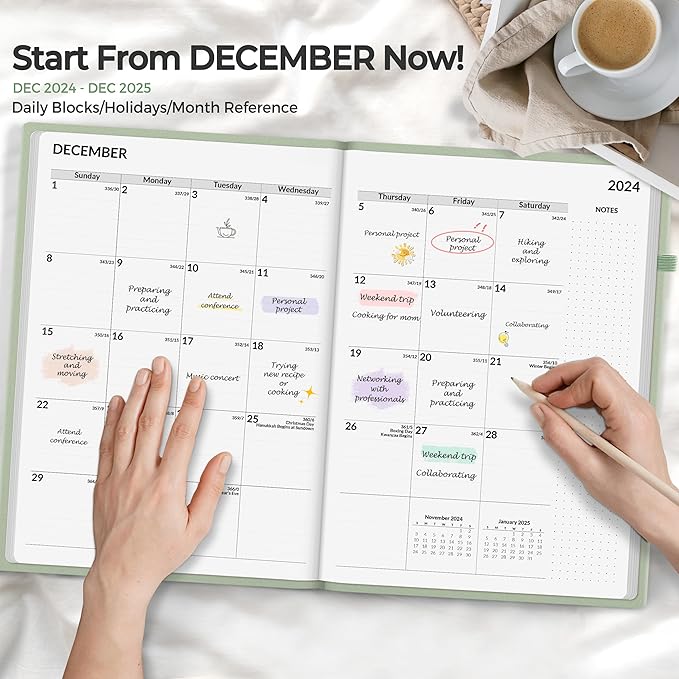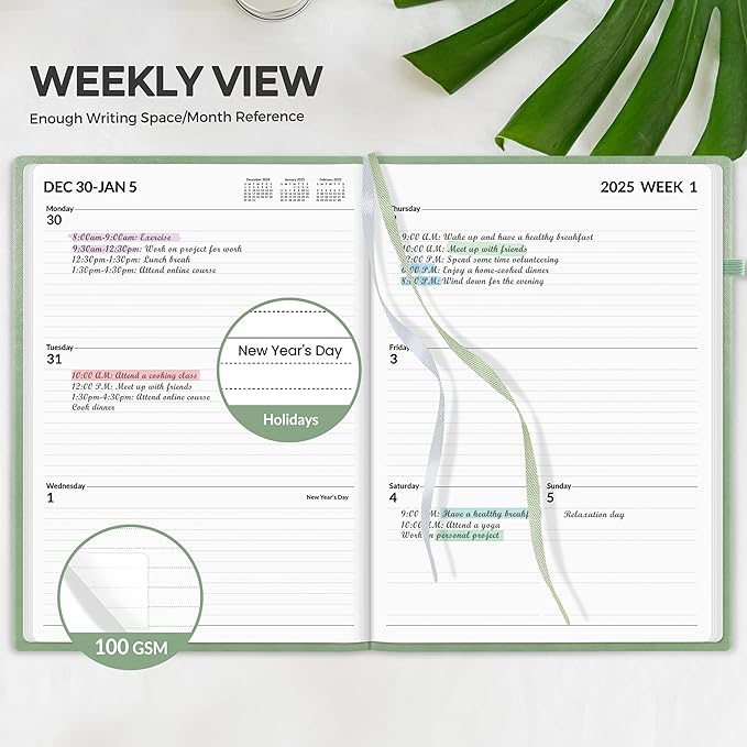 - Weekly View - 2-page weekly spread from Monday to Sunday provides generous lined writing space along with popular holidays and month reference previews, allowing for easy appointment, note, and daily task management.