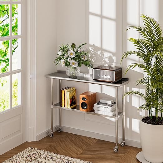- Space-Savvy Narrow Table: Measuring 14x48x34 inches (LxWxH), with a 14-inch slim tabletop, the stainless steel table is designed to utilize those overlooked nooks and tight corners, Adjust the undershelf freely to fit your storage needs