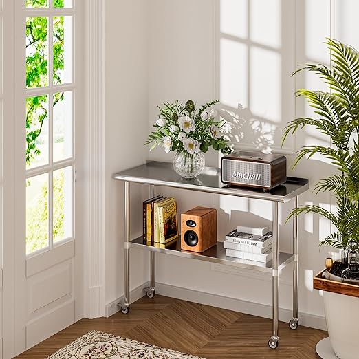 - Space-Savvy Narrow Table: Measuring 18x48x34 inches (LxWxH), with a 18-inch slim tabletop, the stainless steel table is designed to utilize those overlooked nooks and tight corners, Adjust the undershelf freely to fit your storage needs