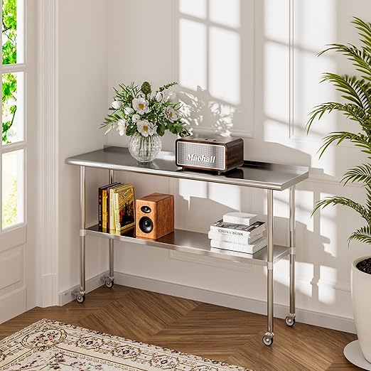 - Space-Savvy Narrow Table: Measuring 18x60x34 inches (LxWxH), with a 18-inch slim tabletop, the stainless steel table is designed to utilize those overlooked nooks and tight corners, Adjust the undershelf freely to fit your storage needs