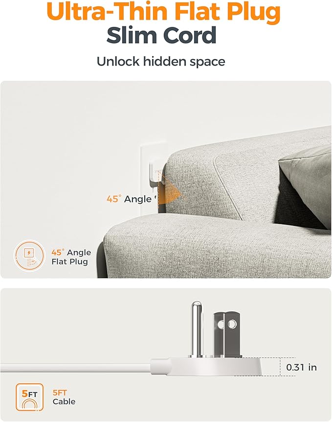 - Right Angle Flat Plug: Flat extension cord with an ultra thin 0.31in flat head. This mini extension cord power strip can easily fit into tight spaces and hide behind sofa, bed; The 45 degree right angle design create additional space for other plugs