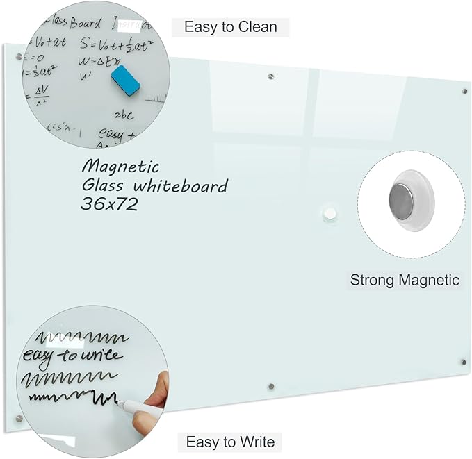 Glass Magnetic White Board - 72 x36 Inches Dry Erase Glass Whiteboard for Wall, Large Wall Mounted Glass Board for School, Office and Home