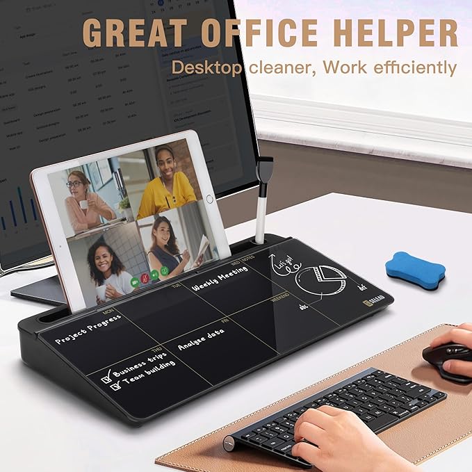 - 💯MULTIFUNCTIONAL: Writing+Storage+Hold iPad/phone/pen+Keyboard Stand, our desktop white board is an all in one multipurpose desk board buddy. Equipped with 2 white dry erase marker and 1 blue eraser. One purchase, All in place!