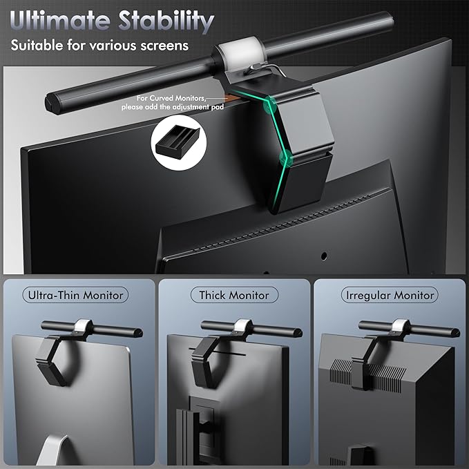 - Easy Installation, Ideal for Curved/Ultra-Thin Bezel Monitor: Our patented three-section weighted clip with adjustable dual-pivots fits securely on most monitors, ensuring a damage-free installation. This curved monitor light bar features an integrated adjustment pad, specifically designed for curved monitors (up to 1000R). The clamp also provides clear space at the top for easy webcam placement