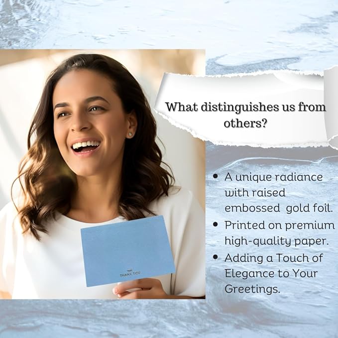 - HIGH QUALITY MATERIAL - Crafted with solid and heavy-duty 320 GSM Italian thick textured paper card, these greeting cards boast a high-end finish with embossed gold foil. The non-glossy paper ensures no fingerprints or scratches when handling these thank-you cards, and they will not smudge or smear.
