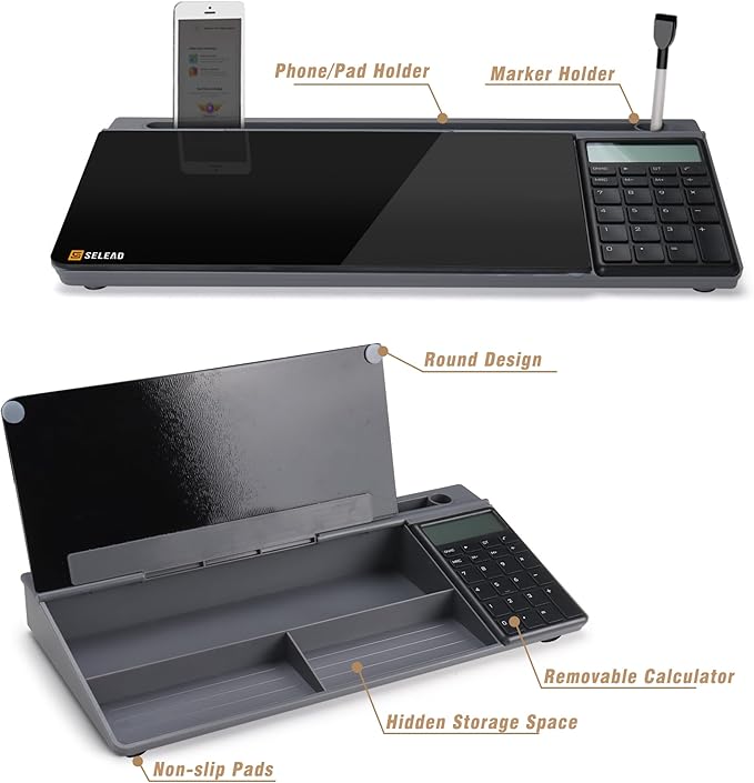 SELEAD Desktop Glass Whiteboard with Calculator, Organizer, Markers, Eraser, Holder - Black Dry Erase White Board Computer Pad Keyboard Stand for Home, School, Office Desk Cubicle Accessories