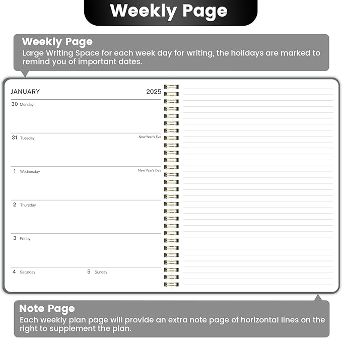 - 📝 Weekly Page - Each weekly page of this 2025 planner occupies 2 sheets, left page is for the whole week days, each day provide rules ample area for you to write, right page is a whole lined note page for you to write some additional daily things.