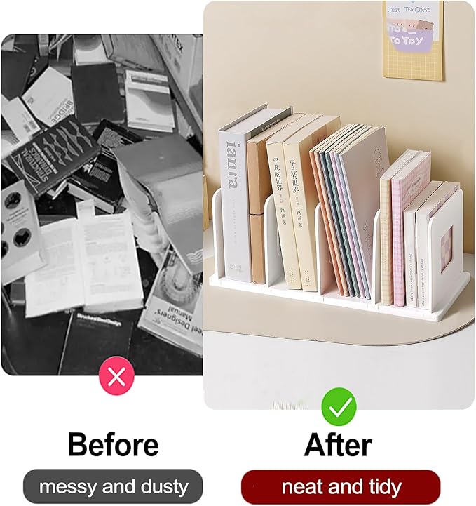 - 【Sturdy & Durable】: Our magazine organizer is made of high quality HIPS material, which is rugged, waterproof and moisture-proof, can support most items, 310 grams per package, stronger than the regular 250 grams. The large capacity desk organiser adjustable baffle plate is thickened, not easy to collapse, can firmly support the bookshelf.