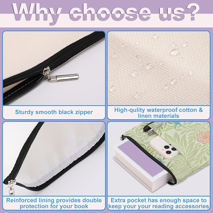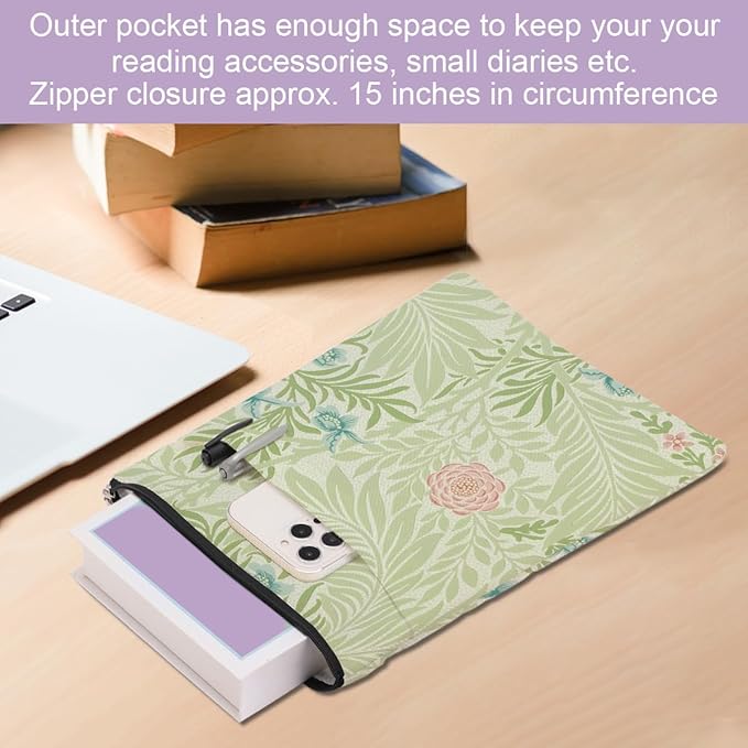 - Zipper Close & Outer Pocket Storage: The book cover closes with high-quality smooth zipper so the book won't slip out of the book sleeve accidentally. It has an additional organizer pocket, and the size is about 9.5 x 8.7 inches offers a enough space for your accessories, notebook, as e-reader, small diaries, stationery, cosmetics, sunglasses, or other small decorative stuff. Great convenient for your daily use.
