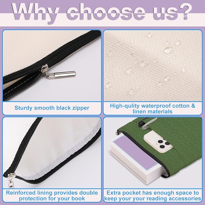 - Zipper Close & Outer Pocket Storage: The book cover closes with high-quality smooth zipper so the book won't slip out of the book sleeve accidentally. It has an additional organizer pocket, and the size is about 9.5 x 8.7 inches offers a enough space for your accessories, notebook, as e-reader, small diaries, stationery, cosmetics, sunglasses, or other small decorative stuff. Great convenient for your daily use.