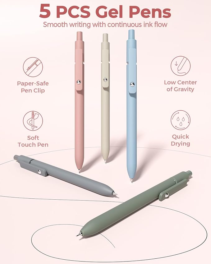 - 5 PCS Black Ink Gel Pens: These retractable gel pens have a skin-like body and a gentle paper-safe clip for a comfortable hold. The weighted spring ensures smooth writing, with quick-dry ink to avoid smudges. Five extra refills are included for extended use