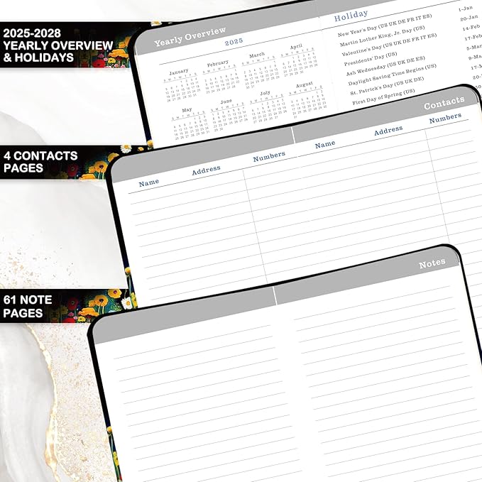 - ADDITIONAL PAGES - This 2025-2027 monthly pocket calendar for purse covers the yearly overview and holidays from 2025 to 2027, making it easy to track your important plans and dates. 4 contacts pages are composed of name, address and numbers which can help you quickly find the contact information of the person you want. The 60 additional Notes pages offer plenty of lined writing space to jot down what you want.