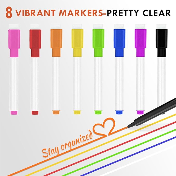 - 【8 Vibrant Markers-Ultra Clear Writing, Easy to Erase】The magnetic fridge calendar dry erase set come with 8 markers with 8 vibrant colors are visible on any background, light or dark.The markers with fine pen tip are smooth to write on the acrylic fridge calendar.The handwriting is easy to erase with just a piece of cloth or wet tissue even if it stays for a long time,you can easily wipe it off without leaving any residue
