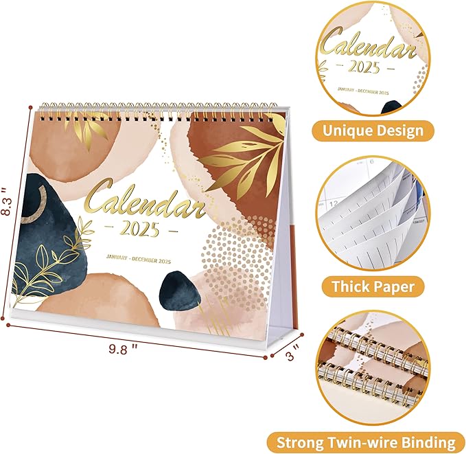 - 2025 Desktop Calendar - With the important holidays indicated, this stand-up desk calendar runs from January 2025 to December 2025. The dimensions of this standing desktop calendar are 10" x 8.3", making it the ideal size for your desk to facilitate simple and efficient daily planning, scheduling, and monitoring without consuming excessive desktop real estate. Also ideal for use at home, in the office, at school, or with family, is this desk calendar 2025.