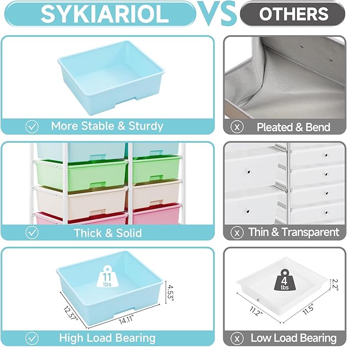 - Symmetrical Tiered Storage: Our storage drawer cart boasts a symmetrical design with four drawers on each side, totaling eight drawers for extensive storage. There are different color drawers for to store and classifying your stuff. Above the drawers, an open shelf provides additional display and accessibility for your decorations or frequently used items, while the wooden tabletop offers a strong surface for plants, DIY machines, printers, and decorative pieces.