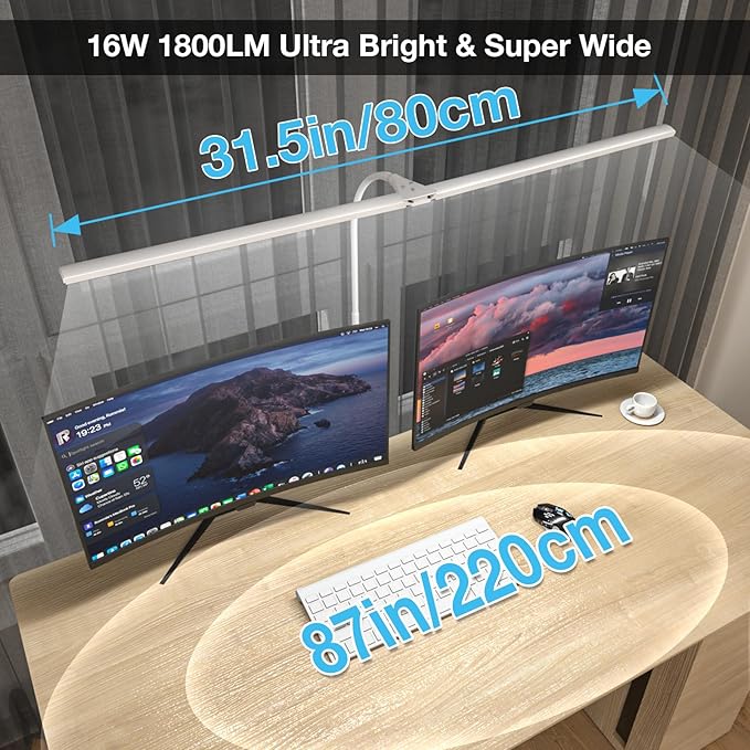 LED Desk Lamp, 31.5'' Wide Double Head Desk Lamps for Home Office, Dimmable 25 Lighting Modes 16W 1800lm Bright Desk Lighting, Eye Caring Architect Table Lamp for Workbench Monitor Study, White