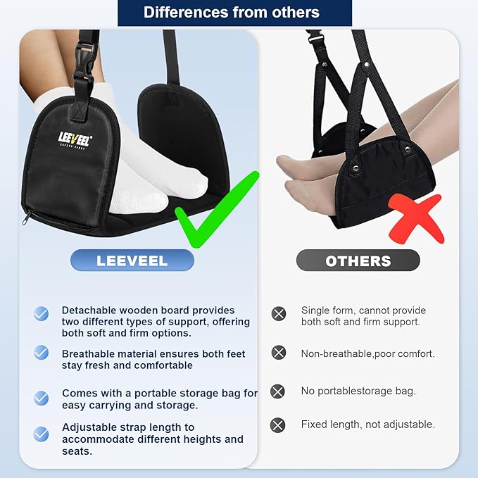 - INNOVATIVE DESIGN: Our foot hammock for plane travel features a reinforced hardboard inside the base,ensuring the footrest remains flat,stable,and spacious.Unlike other unsupported foot hammocks,the hardboard support prevents your feet from collapsing and keeps them comfortably separated,avoiding any discomfort from being squeezed together.Combined with memory foam filling,it's like sitting in a recliner with your feet resting on pillows.