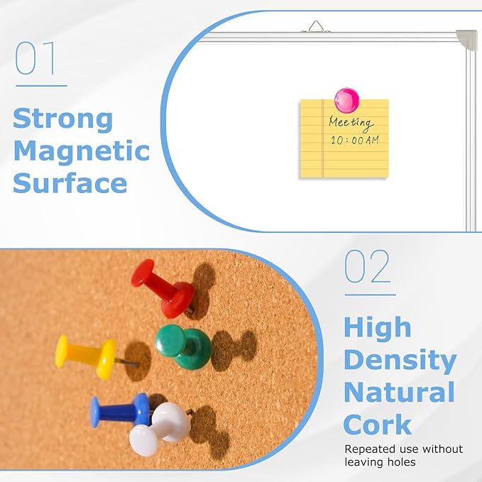 - High-density Corkboard: This dry erase board is a combination board of white board and cork board. The cork board uses high-density natural cork, which is repairable and can be pinned notes several times without huge ugly pinholes. Enough thick cork board is suitable for holding pushpins and so that pins will not go through your corkboards. One display board, two functions.