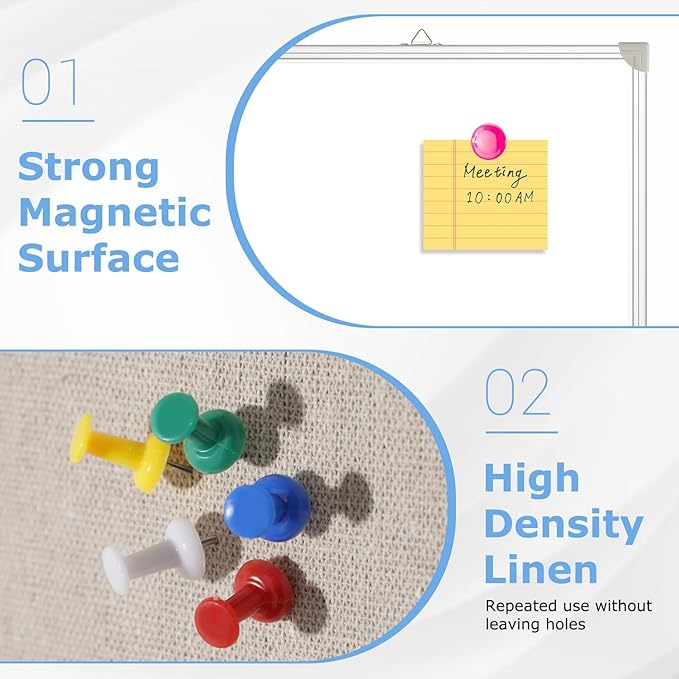 - Magnetic & Double sided surface: This whiteboard combo has a strong magnetic surface, with our included magnets, you can post documents, photos, etc. on the board. This big white board is also double sided, greatly increasing writing space to release your full inspiration.