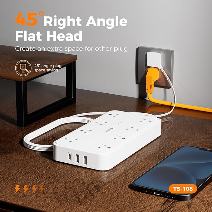 Power Strip with Surge Protection, TESSAN Flat Plug Extension Cord with 8 Outlets 3 USB Ports(1 USB C), 1080J Wall-Mounted Charging Station for Apartment Office School Dorm Room Essentials