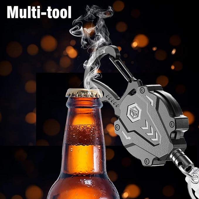 - [Multi-function tool] Cool tactical badge reel with key chain ring and ID badge clip not only can hang work ID name badge holder, keys, gadget buddy accessories, but also can help you open the beer cap smoothly. It can be fixed on belts, backpacks, handbags, outdoor tents. It aslo makes a great practical present for men, boyfriends, family, friends
