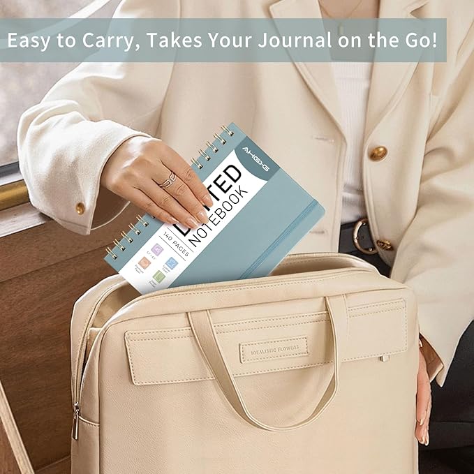 AHGXG Bullet Dotted Journal Spiral Notebook, Hardcover Leather Dotted Notebook 140 Pages, A5 Dot Grid Paper Notebook, 100 gsm Thick Paper, for Bullet Journaling, 5.7" x 8.3", GrayBlue