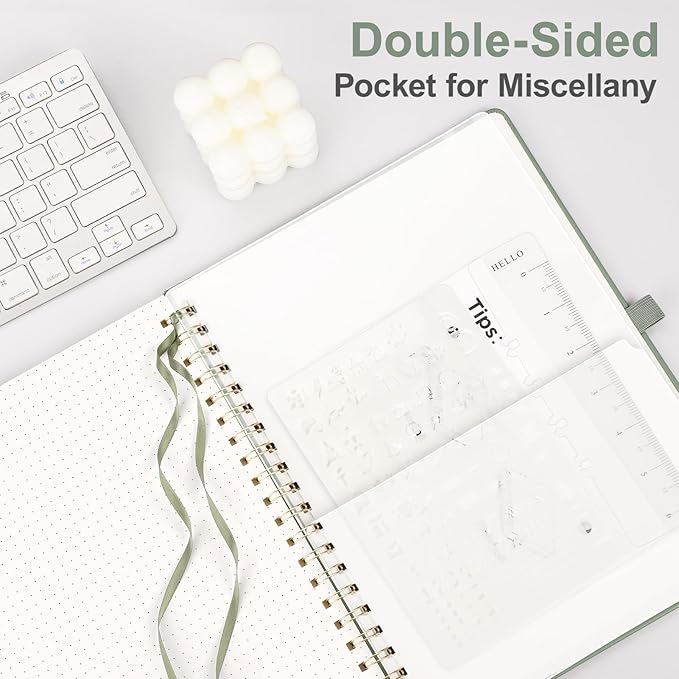 - PRACTICAL LAYOUT: Equipped an elastic band, a pen holder and removable bookmark ruler to keep your notebook organized. Comes with a DIY bookmark with a ribbon for self-attachment to the spiral, serving as a bookmark. Features a double-sided pocket for storing miscellany and 2pcs journal stencil for adding creative to your pages