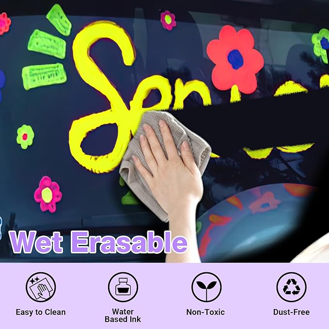 - Easy to Clean: Wet-erasable chalk markers wipe off effortlessly with a damp cloth. Perfect for frequent use without damaging car windows or glass surfaces