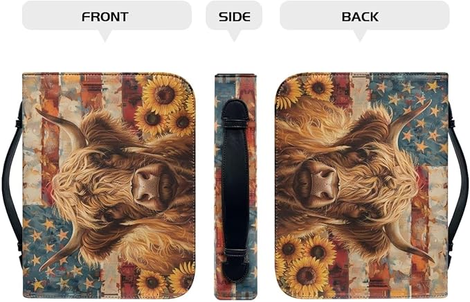 Lotusorchid American Flag Highland Sunflower Bible Covers for Women Waterproof Bible Bag Leather Men Bible Carrying Case Church Bag Bible Protective with Handle and Zippered Pocket