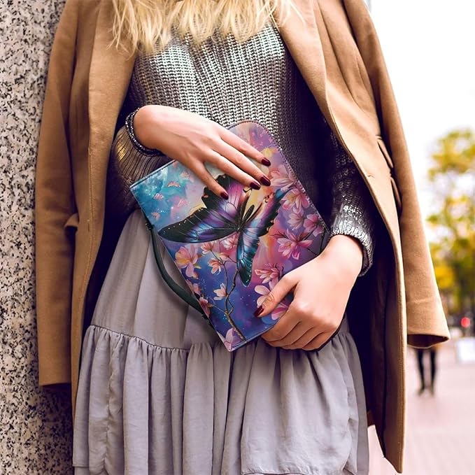 Lotusorchid Cherry Blossom Butterfly Printed Bible Bags, Faux Leather Bible Covers with Handle Pockets for Women, Blue Butterfly Sturdy Bible Bag for Girls Ages 8-12, Christian Bible Study Accessories