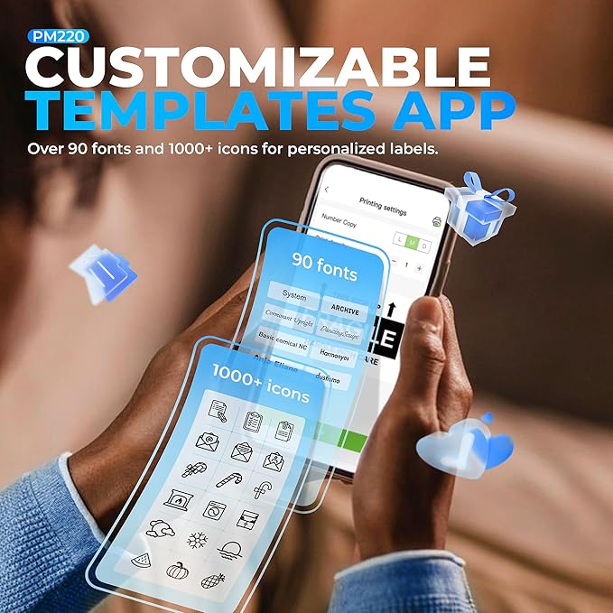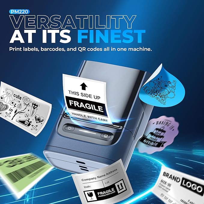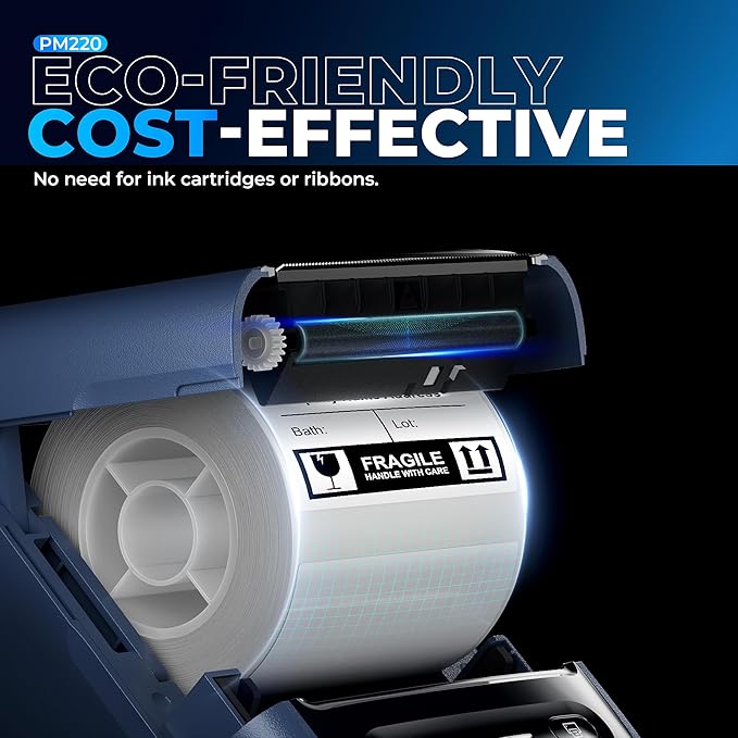 - Powerful APP- The PM220 label maker machine with tape comes with label templates and can set up your own templates. This label printer allows you to customize and format labels, supporting various features such as QR codes, barcode labels, tables, materials, time, figures, text, icons. This label maker machine with tape APP included more than 90 +Fonts, 14+ Languages, 450+ Materials. Please do not tear or destruct the green sticker on the back of the label strip, otherwise it will affect the printing effect