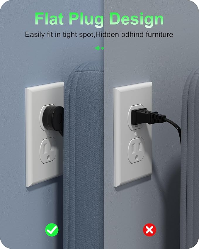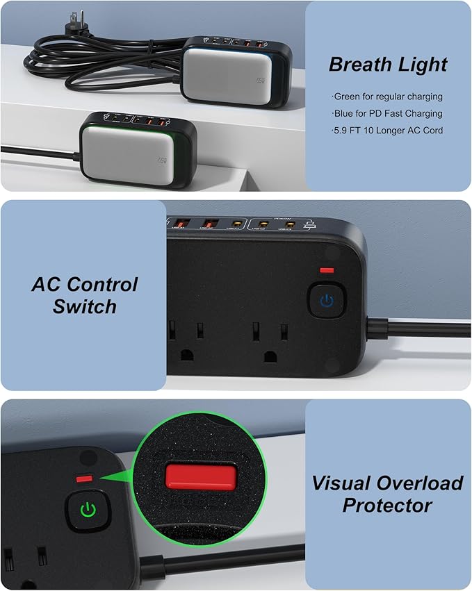 - Unique Product Design: power strip with USB ports features distinctive breathing light design, keeping you informed of your devices' charging status at all times. When the light turns green, it indicates that the device is in a regular charging speed, when the light shifts to blue, it signifies that the device is undergoing PD rapid charging. This surge protector is equipped with switch to control the AC ports and turn on or off AC ports without having to unplug the chargers