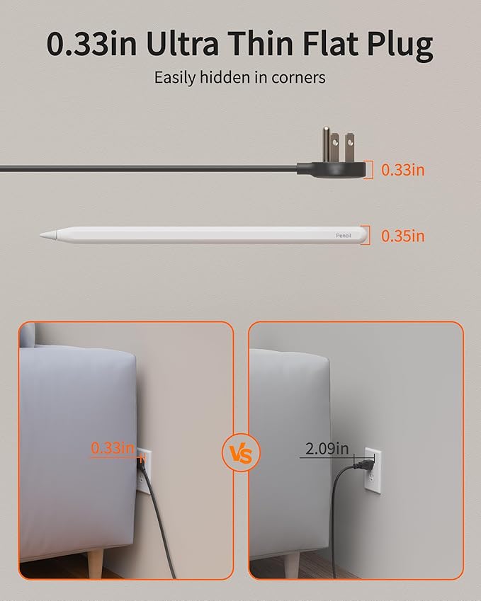 - 【Ultra Thin Flat Plug & 5Ft Extension Cord】: With only a 0.33-inch ultra-thin plug, which is much slimmer than traditional plugs, so it's easier to access any wall socket and hide in the back of the sofa. And a 45° right-angle design will not block the bottom receptacle of your duplex wall outlet. The 5-foot flat cable is 50% thinner than the traditional power cords to run it under a rug or along walls without adding unsightly bulk or creating a trip hazard.