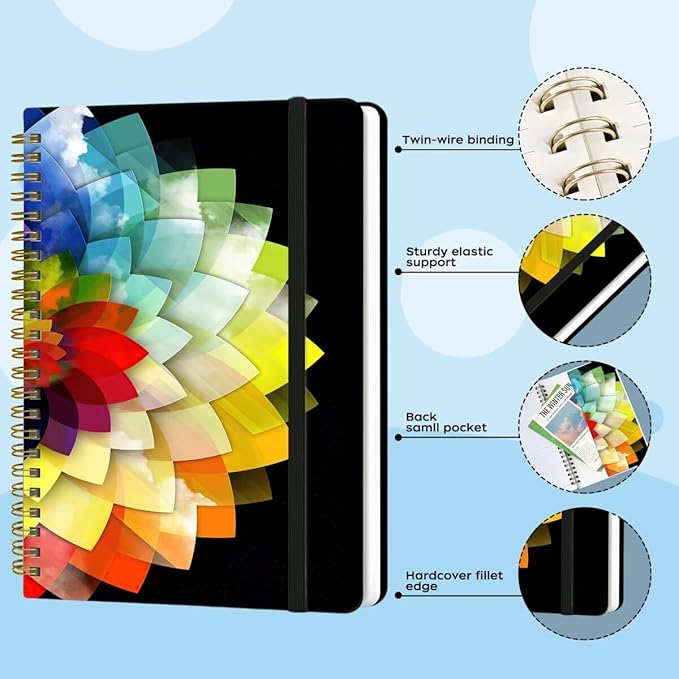 - 【Enhanced Design and Sturdy Binding】The firm twin coils allow for easy flipping of pages, while elastic cords inside secure inserts and documents. The notebook lies flat when opened, catering to both left-handed and right-handed users.And an inner pocket on the last page, you can place some small cards, business cards.