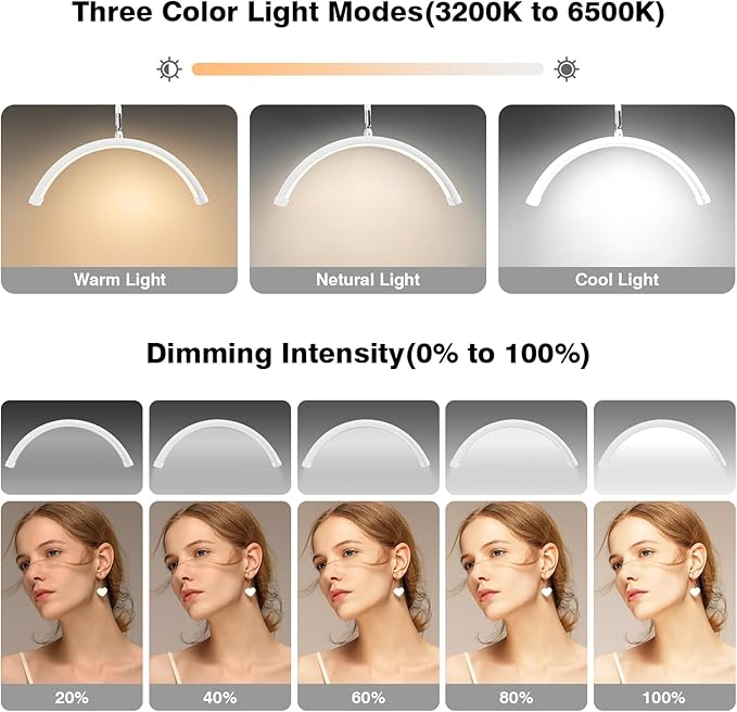 - 【A Must Have for Beauty Professionals】 Mznoo half moon light is designed for the salon businesses, such as beauty salon, nail salon, eyelash extension salon, tattoo salon, etc. It can adjust three light modes from warm to cool providing five color temperatures(3200K, 4000K, 4800K, 5600K and 6500K); in addition, each color temperature has five brightness levels, you can choose the perfect light mode for your needs.
