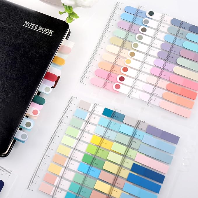 - 🗂️【Not Cause Damage】15 sets book markers with ruler for books, 1.6*0.5 inch. These clear sticky notes are sticks easily, and the adhesive stays put on the sticky tab and doesn't come off the computer. These page markers for notebooks have special stickiness, when you tear it off, it will not hurt your books.