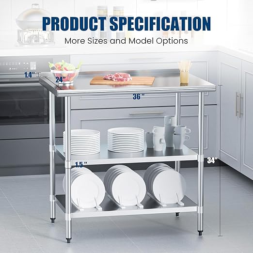 - Heavy-Duty Worktable: Measuring 36x24x34 inches, the stainless steel kitchen table provides a spacious workspace and 2 undershelves. Can support up to 450 lbs on the tabletop and 350 lbs per undershelf, accommodating various storage needs