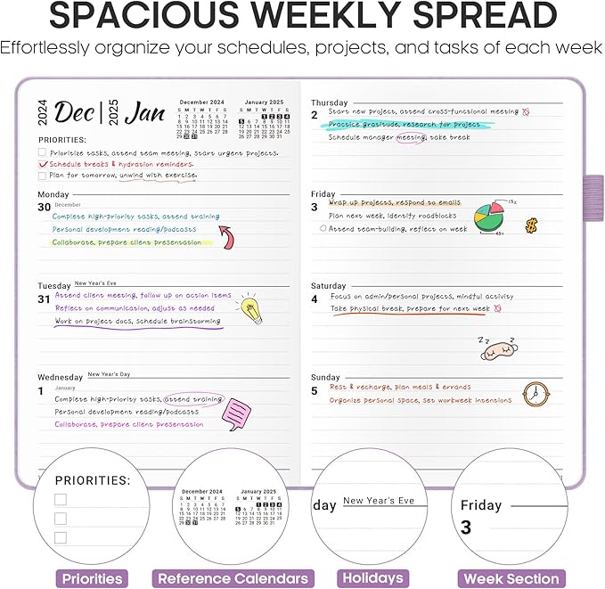 - Detailed Weekly Views: The weekly view pages offer plenty of space for daily schedules, appointments, and activities. Highlighted priority sections keep you focused on your most important goals. The weekly view pages help you organize and track your week efficiently, giving you a sense of accomplishment as you complete tasks.