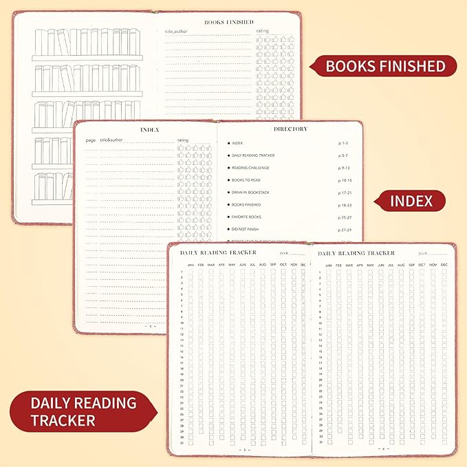 - Multifunctional Design - There is an index preview help you check your reading and rating quickly. Daily reading tracker tracking your reading progress. The challenge of reading inspire you to finish your goals that you set at beginning. Write books you have read and books you borrowed or lent and more.